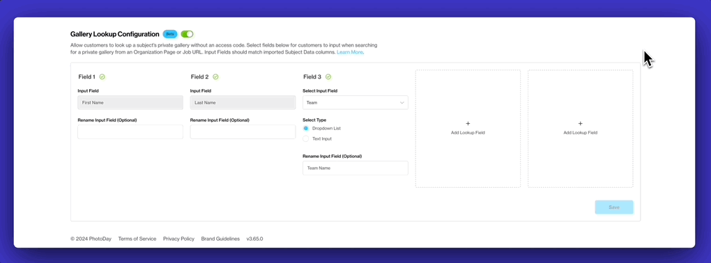 This is where you can select the fields customers can input when searching for a private gallery from an Organization Page or Job URL.
