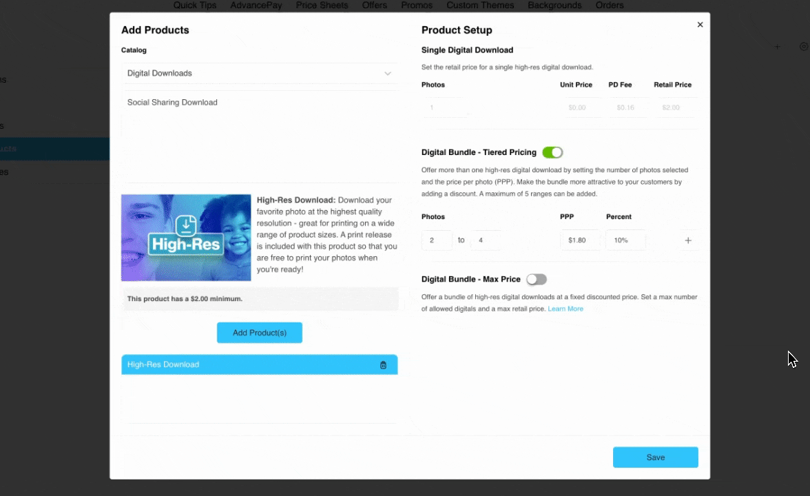 Let’s start with Tiered Pricing for Digital Download Bundles which allow you to offer automatic discounts to customers based on the number of photos that they would like to purchase as High-Res Downloads. Tiered pricing bundles are ideal for upselling in the storefront and in the cart, promoting discounts based on a "Buy More, Save More" approach. If you currently offer multiple packages with varying quantities of High-Res Downloads, tiered pricing bundles can replace all of these!