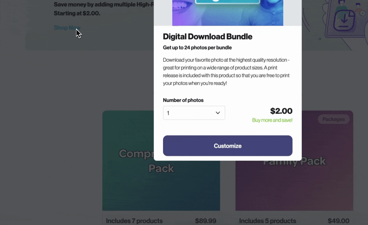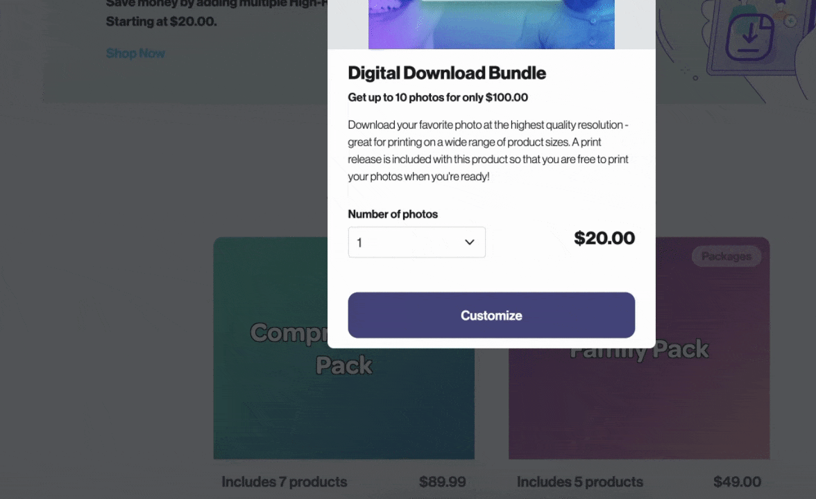 - When they select a High-Res Download product, they will see the option to specify how many photos they want to purchase.