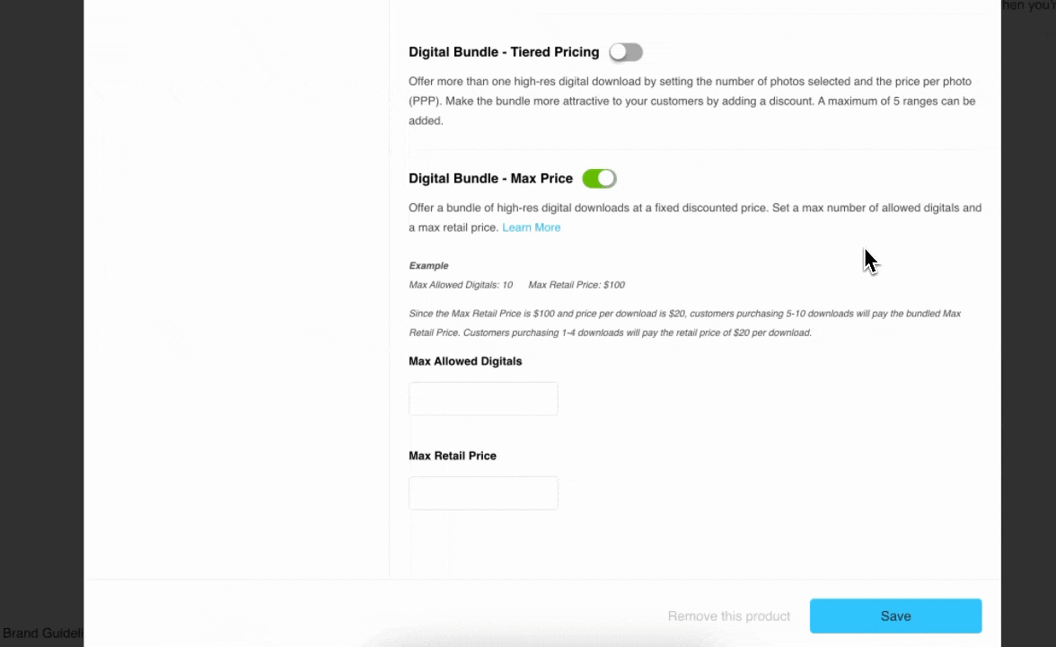 In this example, the a la carte price per High-Res Download is $20, the Max Retail Price is set to $100, and the Max Allowed Digitals is set to 10. Customers purchasing 5-10 downloads will pay the bundled Max Retail Price because it’s the better deal—essentially, the 6th, 7th, 8th, 9th, and 10th downloads added to the bundle would be free! Customers purchasing only 1-4 downloads will still pay the retail price of $20 per download to not overcharge them.