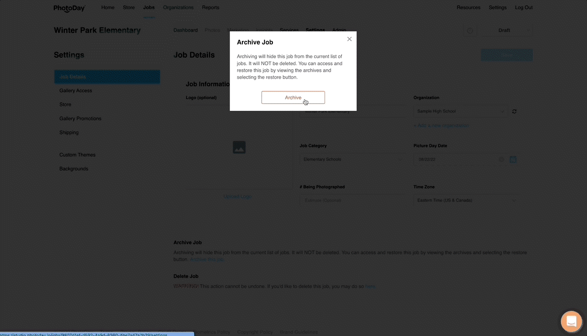 Archiving a job allows you to remove it from your current list of jobs without deleting it from your account. It can be restored at any time from the Archived section of your studio panel (we’ll show you how in the next section). This is especially useful if you create test jobs, have to cancel a shoot, etc.
