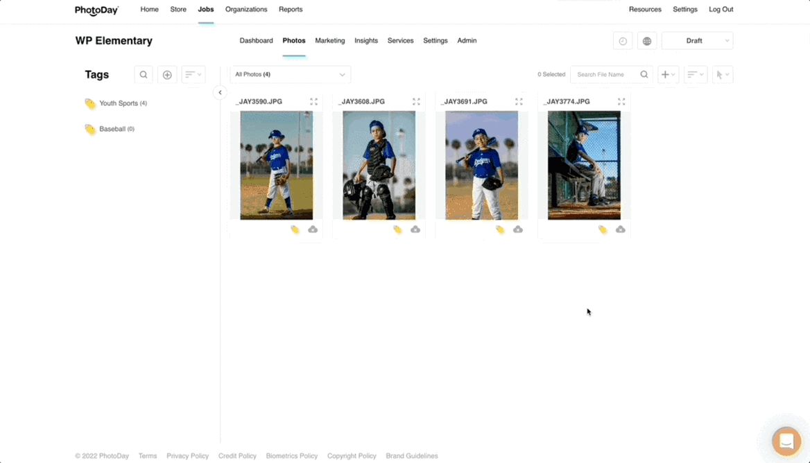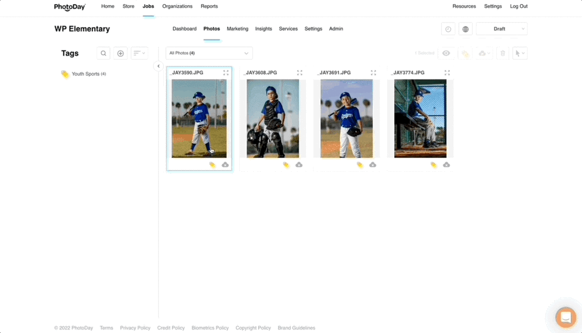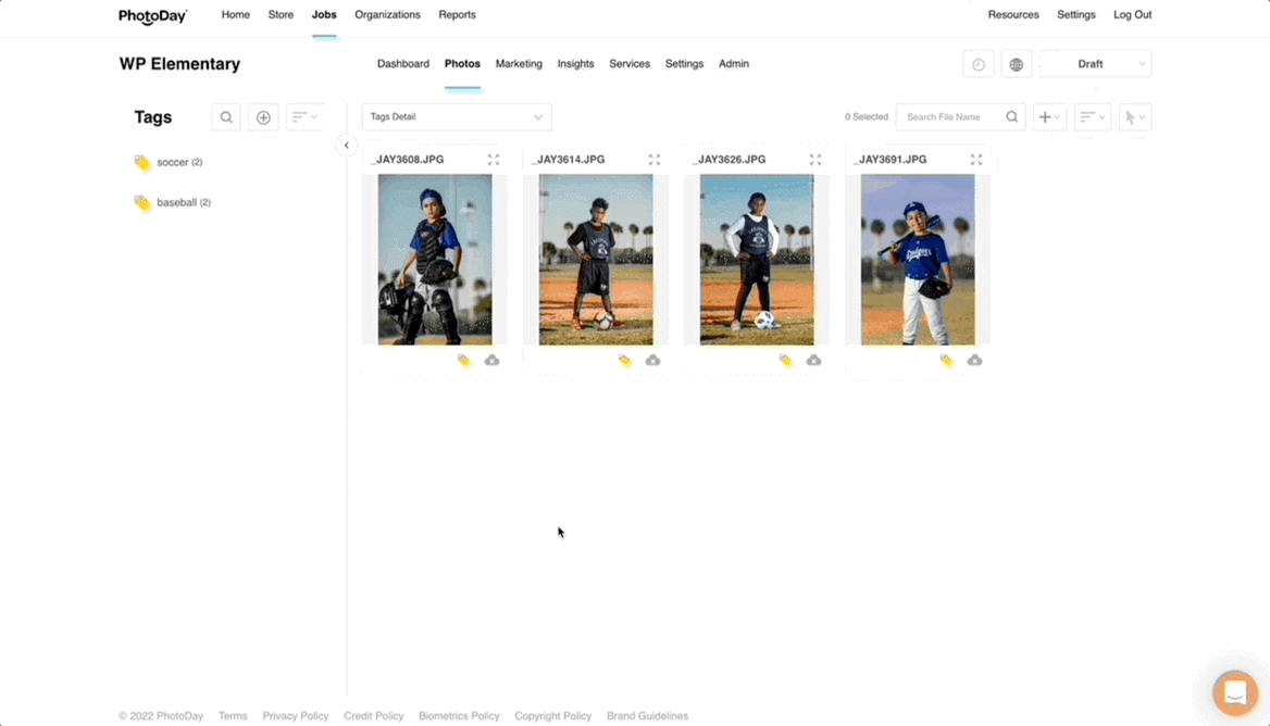 Whether you wish to organize your photos by team name, jersey number, picture day date, etc. using tags allows you to add structure to your photo collection and helps your customers to quickly filter their searches and get them on their way to purchasing photos.