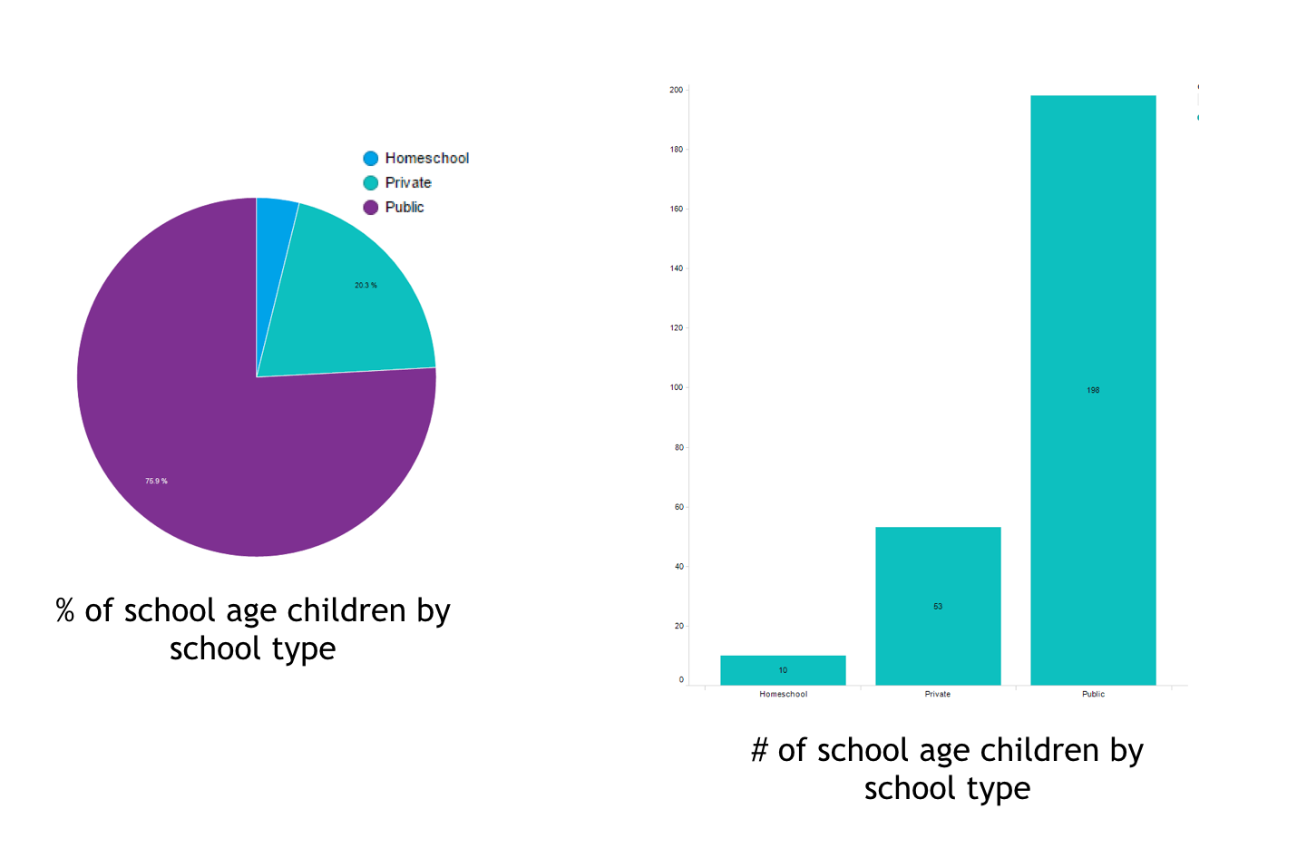 - 75% of the parents send their children to public school, with 20% in private school and the rest being homeschooled.