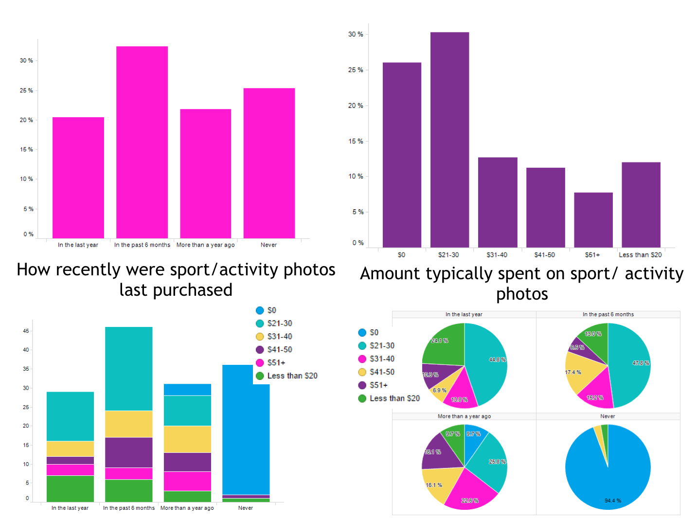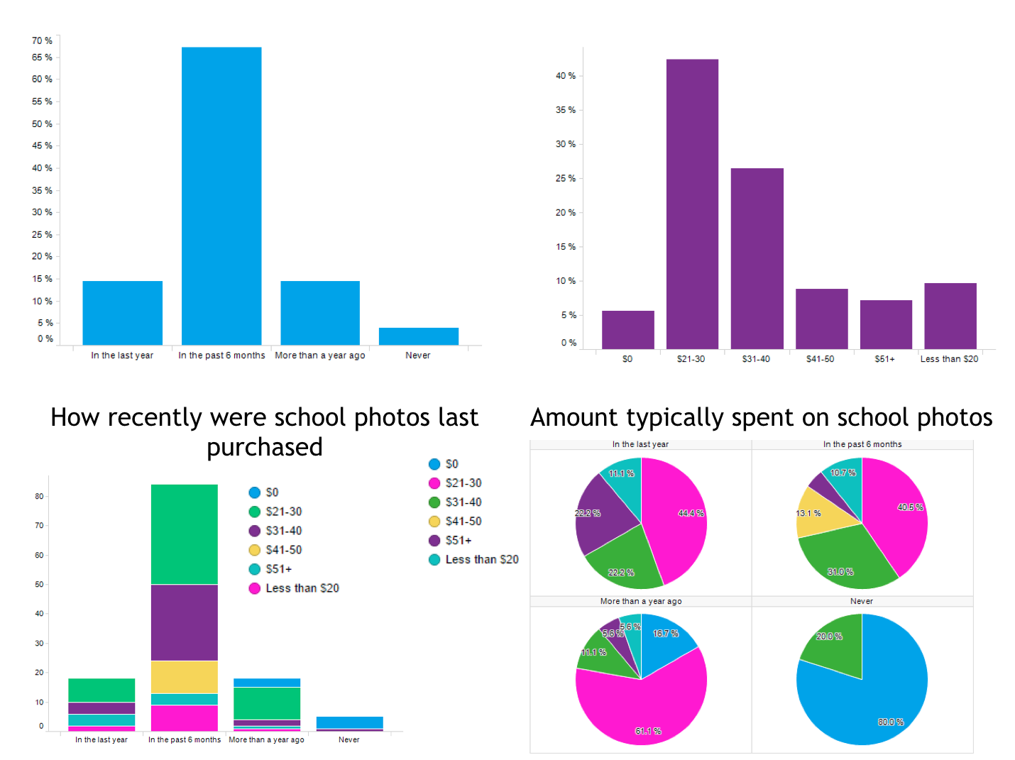 - Over 65% of parents have purchased school photos in the past 6 months, 40% spent an average of $21-30 per child, and 31% spent $31-40 per child. Surprisingly, only 49% of parents have purchased sports & activities photos in the last year, with 46% spending an average of $21-30. Around 37% have spent over $31.