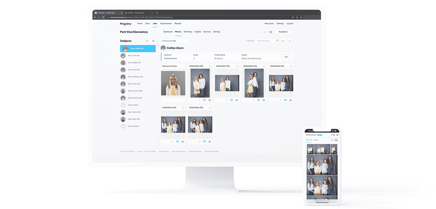 This is where FaceFind works its magic ✨ Capture syncs the reference photos and data to PhotoDay, so all you have to do is upload your professional photos and watch FaceFind match the right face to the right data. FaceFind is wildly accurate—we've tested it on individuals, buddy poses, group photos, profile views, sunglasses, face masks...it can even differentiate between twins!