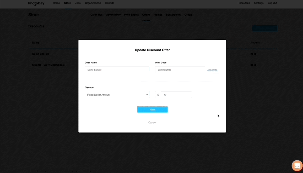 First, give your offer a name (this is only for your reference) and assign it a unique offer code (this is what your customer will see and use). Try and make it something memorable for your customers, as they’ll be tasked with entering it during checkout to apply the discount to their order! You can also click the Generate button and PhotoDay will auto-generate an offer code for you.